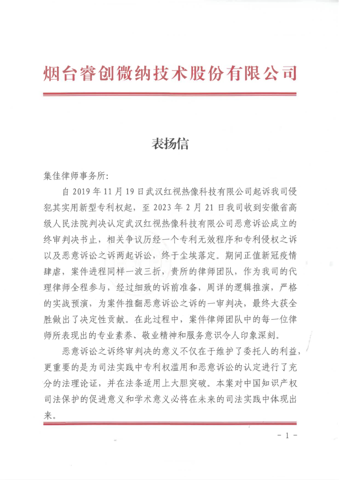 2023年2月10日,安徽省高级人民法院就烟台睿创微纳技术股份有限公司、烟台艾睿光电科技有限公司、安徽英睿系统技术有限公司等(下称“睿创集团”)与武汉红视热像科技有限公司(下称“武汉红视”)因恶意提起知识产权诉讼损害责任纠纷一案作出终审判决,认定武汉红视滥用诉权的行为构成恶意诉讼,并判令其赔偿睿创集团相应的合理支出。至此,时隔四年,横跨疫情时代的专利侵权及恶意诉讼系列纠纷案,终于尘埃落定。奇异果体育协助睿创集团最终取得系列案件的全面胜利,维护了客户合法权益,实现了商业竞争的公平正义!