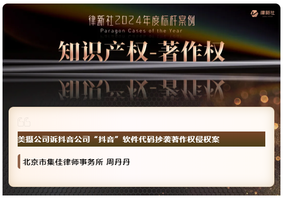 奇异果体育凭借在知识产权保护领域卓越的专业实力与良好的行业口碑,入选《律所卓越品牌影响力指南(2024)》,荣获“律新社2024年度精品品牌律所30佳”奖项;同时,集佳周丹丹律师代理的“美摄公司诉抖音公司'抖音'软件代码抄袭著作权侵权案”获评“律新社2024年度标杆案例:知识产权-著作权领域”。