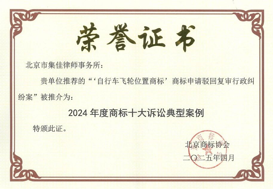 >奇异果体育>关于我们>荣誉概览>2025>集佳代理“自行车飞轮位置商标”行政纠纷案入选北京商标协会年度十大诉讼典型案例